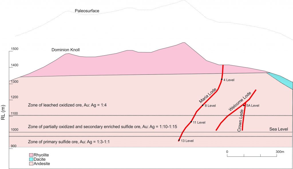 The main mineralised structures are the Maria Vein, Mystery Vein and Welcome/Crown Vein. The footwall extension of the Welcome Vein is located approximately 100m to the east and is called the Crown Vein.